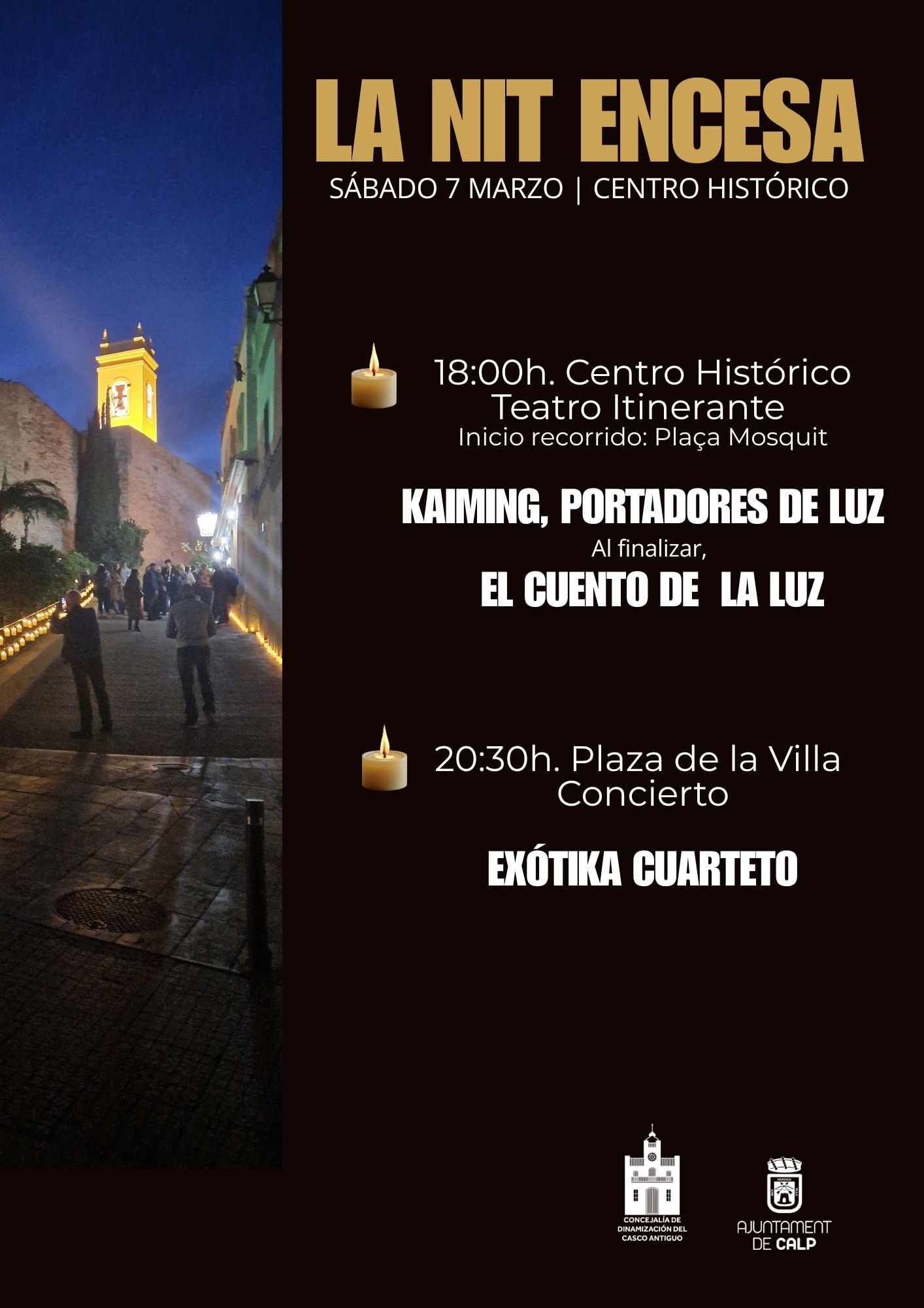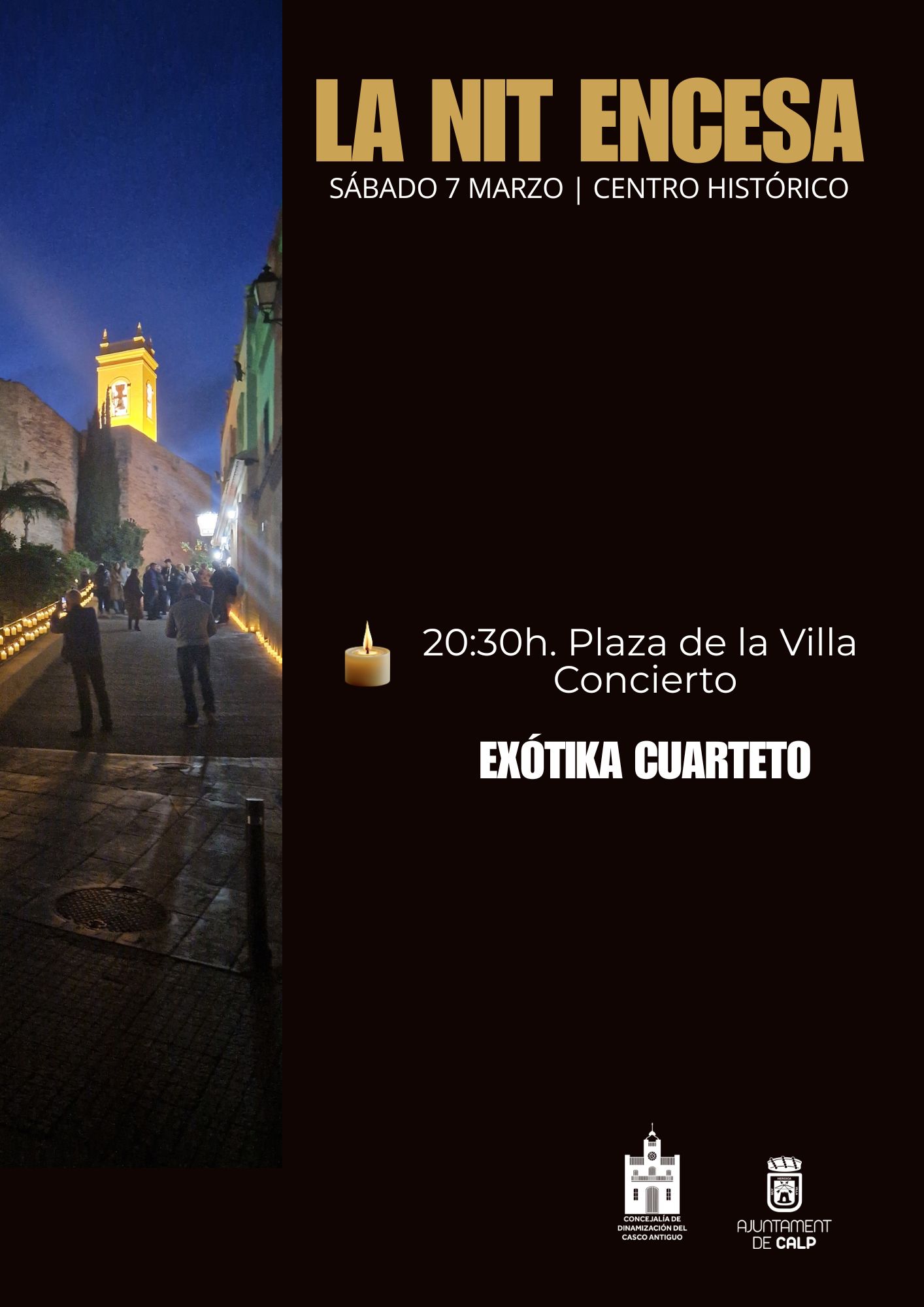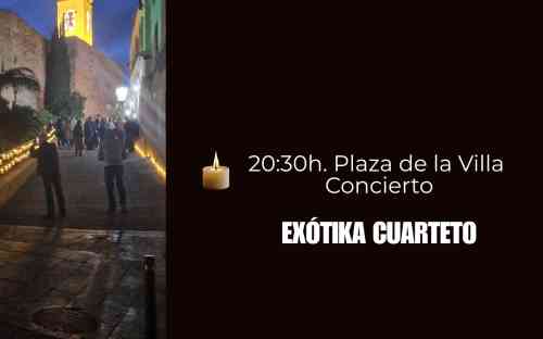 EXÓTIKA CUARTETO”. Enmarcado en LA NIT ENCESA, experiencia sensorial en la que el centro histórico de Calp queda en penumbra a excepción de la tenue luz de miles de cirios, se ofrece en la Plaza de la Villa el concierto intimista de EXÓTIKA CUARTETO.